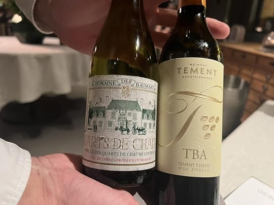To go with the desserts, we were served a Sattlerhof Trockenbeerenauslese, Styria 2017. There is no such thing as a bad or even mediocre trockenbeerenauslese. This was a fine example of the species. To make it, individual grapes are picked that exhibit just the right amount of botrytis-induced concentration of sugars. The resulting wine combines sweetness, structure and complex aromas. It’s the pinnacle of the old German system of wine classification.