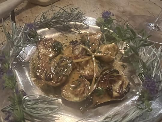 He came back and forth from the kitchen, where he was preparing a whole menu for a room full of guests, to grill the turbot for us. He also used the wood fire to make a butter caper sauce and a plateful of young artichokes. This all combined to make the tastiest turbot dish I’ve ever had.