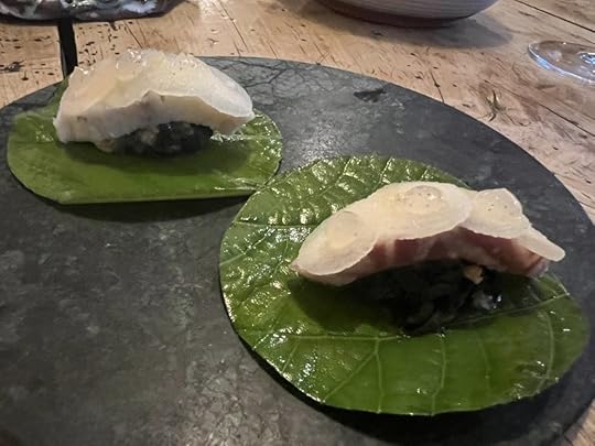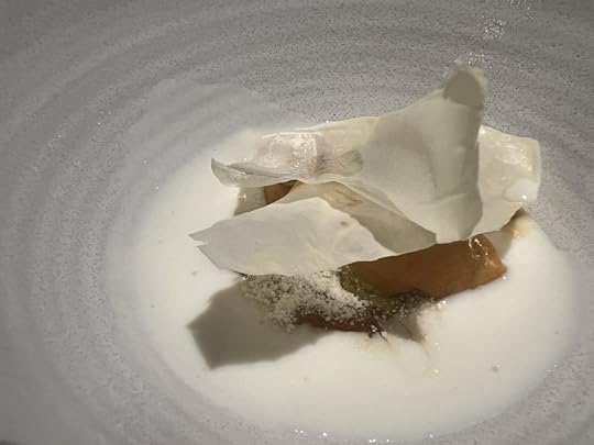 Chef Lozano introduced the next dish, cod kokotxas with ramps pil pil. Cod is one of the only ingredients that is common in both Norway and Spain, he explained. I was eager to try this Norwegian version of kokotxas, but it fell short of expectations. These cod cheeks should be gelatinously tender, but they were not. They were quite tough, probably because while the chef was chatting with us, his sous chef cooked them at too high a temperature. This was an avoidable mistake and made me sympathize with the chef, whose enthusiasm was undiminished in the face of the challenges of running a world-class restaurant near the North Pole. The pil pil sauce was excellent but it couldn’t make up for the toughness of the kokotxas.