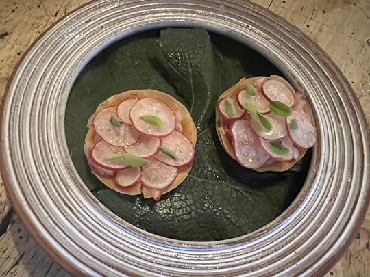 In the next amuse, thinly sliced radish and foraged clover leaves, drizzled with lovage oil, topped a goat cheese mouse in a delicate tartlet, a taste-awakening combination.