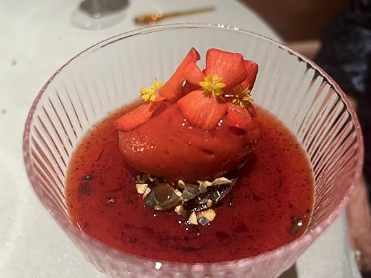 The first desert was a pickled rhubarb rice pudding with strawberry sake granita and a pear hibiscus sorbet.