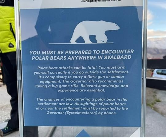 We’re in Longyearbyen on Spitzbergen Island of Svalbard, above the 78th parallel. That’s as far north as the northernmost tip of Greenland. To get there, we sailed in the Hurtigruten ship Trollfjord for two days north across the Arctic Ocean from North Cape, Norway, which is the farthest north point of land in continental Europe. When you dock in Svalbard, you’re greeted by a sign warning of the dangers of polar bears.