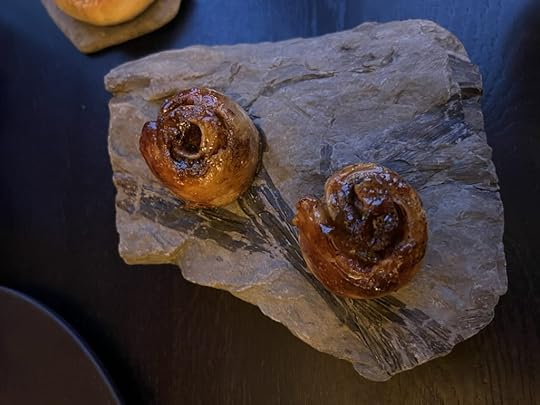 We were then served these lovely house-made brioches with smoked butter, black garlic and local seaweed. The server pointed out that the rock on which she presented them was found locally by the chef and contained fossilized tropical plants, showing that Svalbard was once located much closer to the equator. The tropical forest that grew here gave rise to the coal that was the reason for the island’s being settled and for Huset originally having been built.