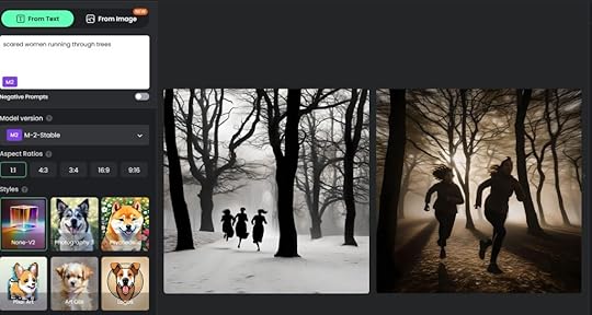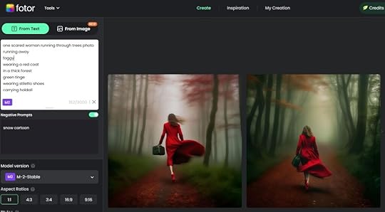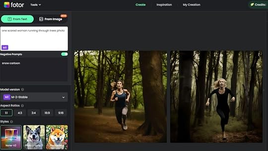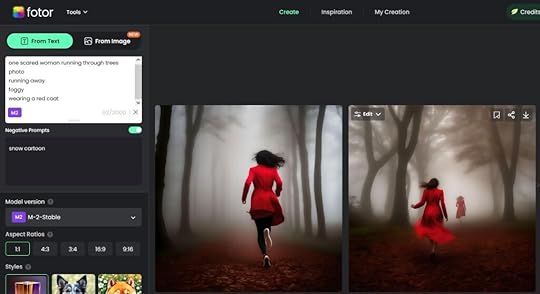 How to use Artificial Intelligence (AI) to Create Cover ArtworkUsing Artificial Intelligence to create an image for the book’s cover, though, seems somewhat simpler. To see how easy it is to use AI to create the artwork for a book cover, I went to the FOTOR website and selected their “Text to Image” option. I was then able to enter a text prompt to start their artificial intelligence working for me. I decided to try to create an image that could be used for the front cover of a thriller, so entered the prompt “scared woman running through trees”. The AI system analysed my text and produce a couple of suggested pictures, although the result wasn’t really what I was looking for: