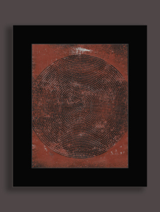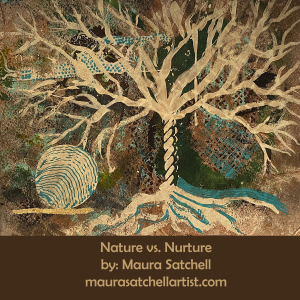 The meaning behind it: Starting with a seed, a tree grows. Add in environmental changes and stressors, and you’ve got either a glorious specimen or a lackluster space hog. This painting reflects on that idea, with gold leaf, linear and other mark-making elements.