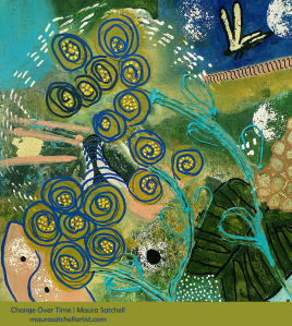 Change Over Time – Mixed media abstract painting on paper with gold leaf by Maura Satchell, Artist. Size: 9″ x 9″ or 23cm x 23cm. List $170The dragonfly has been around for 300 million years during which time the earth has evolved dramatically. This painting pays homage to that idea and to the idea of nature in general.