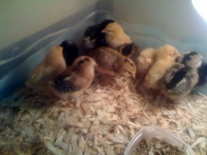 Over the weekend, my friend Kathy Sproger made the trip to an Agway out in the country to pick up her order and mine. Now on the laundry room counter, in an oversized plastic bin and with a light bulb to provide warmth, I have 12 new additions to the Grogan avian family. There are a few each of buff orpington, black barred rock, and ameraucana, known for their pastel blue eggs.