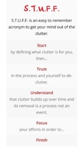 Eric Riddle joined me, and together we have written articles about decluttering and a book, STUFFology 101: Get Your Mind Out of the Clutter. We advocate the process of S.T.U.F.F.—that is, Start. Trust. Understand. Focus. Finish.