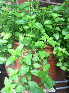 My pride and joy: chocolate mint...yum. Great in iced tea, as a hot infusion, or in a simple syrup poured over ice cream or tossed in fruit salad!
