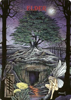 The English Elder tree, the Sambucus nigra or Ogham "Ruis," is the most enchanted of the Ogham trees. Beneath her roots lies a gateway to the Otherworld, the fairy realm. The Elder Mother, or Lady Ellhorn, can be associated with Titania, Shakespeare's Fairy Queen. The Elder tree is also used for spirit contact and symbolically for connection with our own subconscious and the collective unconscious...the otherworld without and the otherworld within. Like in Walter de la Mare's poem, the outer landscape mirrors the one within.