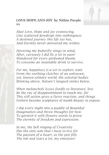 "ചില സന്തോഷങ്ങൾ പലപ്പോഴൊക്കെ ജീവിതത്തിൽ ഉണ്ടായിട്ടുണ്ട്, ദുഖത്തെ സന്തോഷമായി ആഘോഷിക്കുക കവിഭാവനയുടെ ഒരു തുടക്കമായി കാണുക, കാഴ്ച്ചയിൽ ആനന്ദിക്കുന്നു എന്ന് തോന്നി ആ സന്തോഷത്തെ ആശ്ലേഷിച്ചു കൊണ്ട് എഴുതിയ ഒരു കവിത ഇവിടെ സമർപ്പിക്കുന്നു."