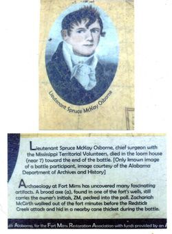 Lieutenant Spruce McKay Osborne was born in Rowan County, North Carolina in 1784. Upon his graduation from college there, he moved to the Mississippi Territory to practice medicine. When the Creek War broke out in 1813, he joined the Mississippi Volunteers as its surgeon and served at Fort Mims.