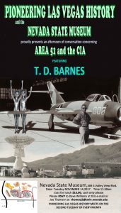 Area 51 Veteran and Author TD Barnes to Speak At the November Pioneering Las Vegas History Luncheon. The subject will be the CIA at Area 51, declassified in 2017 and recently published in Barnes’ CIA Area 51 Chronicles, a three-book series titled: The Angels, The Archangels, and The Company Business.