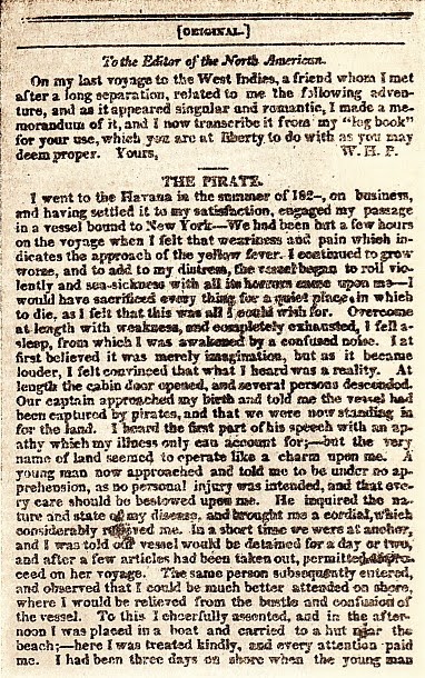 On my last voyage to the West Indies, a friend whom I met after a long separation, related to me the following adventure, and as it appeared singular and romantic, I made a memorandum of it, and I now transcribe it from my "log book" for your use, which you are at liberty to do with as you may deem proper.  Yours, W.H.P.
