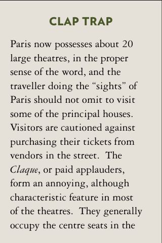 The first installment's an 18 page stroll through curious extracts from literature, like this passage from an 1898 Baedeker's guide to Paris and Its Environs: