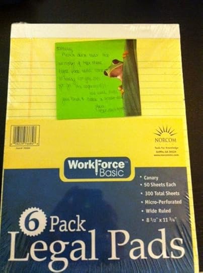 My across the street neighbor moved away a few days ago. We spent tons of time together and her whole family will be greatly missed. Little Guy has already announced that he's going to move into their new purple house with them. (The house isn't really purple.) Before she left, my friend left me this. Yes, that's a 6-pack of yellow legal pads. My favorite. Seriously. I love yellow legal pads in a way that you probably shouldn't love office supplies. She knew about my passion.