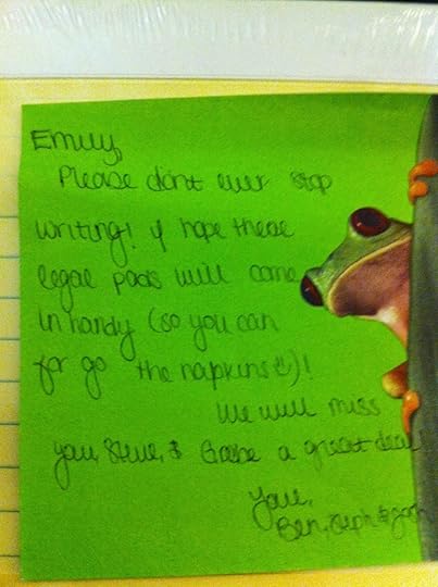 Please don't ever stop writing! I hope these legal pads will come in handy. (So you can forgo the napkins!) We will miss you a great deal.