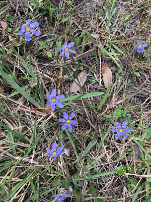 On my walk this morning, i saw blue-eyed grass growing on the roadside. I love blue-eyed grass. Such a simple wildflower. A single blue flower on a single stem of grass. I've tried growing it and always lost it. Today i saw it in profusion--growing in sand (read: limestone) in Florida (read: hot). I don't have those conditions in my garden.
