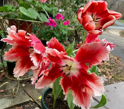 One of the last errands i ran before leaving for Florida for 2 weeks was delivering pots of budding tulips to friends. I gave one to Karen, a Master Gardener friend. Three weeks later, they are still blooming.