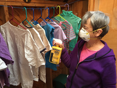 I throw a drawerful of shirts down the stairs. I hang them up in the woodshed. I spray them. Three hours later, i take them off the hangers and cart them back to their drawer. I throw the next drawer full of undershirts down the stairs. Etcetera. Etcetera.