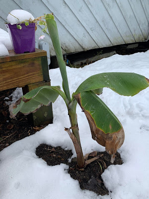 On Wednesday afternoon, before the predicted snow of Thursday and Friday, i planted my banana tree outdoors near the back door, in the semi-shade of the north side of the house.