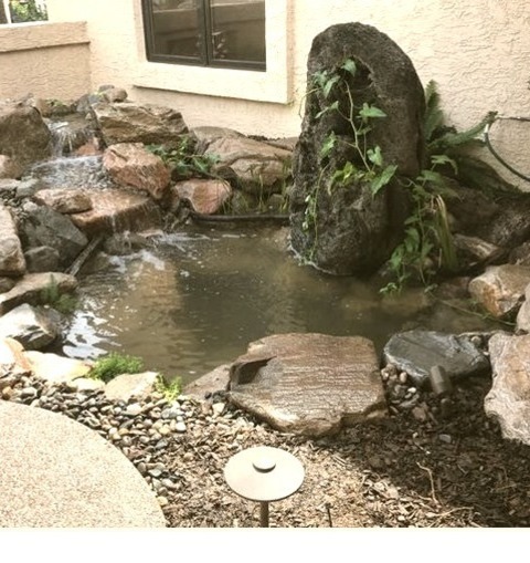 Example of a modern natural pool fountain with large trendy backyard tiles.