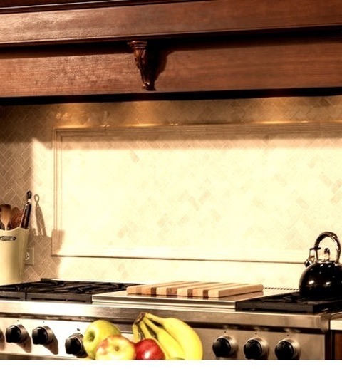 A sizable, elegant kitchen with a u-shaped ceramic tile backsplash, an undermount sink, raised-panel cabinets, dark wood cabinets, quartz countertops, beige backsplash, ceramic backsplash, stainless steel appliances, and an island is shown in the kitchen photo.