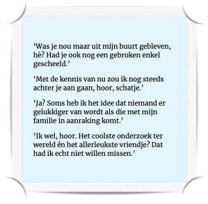 Ik sloot mijn ogen en genoot van het gevoel van de zon op mijn gezicht. Zo met mijn ogen dicht, was het altijd of mijn metazintuig scherper zag. De mensen die door het park wandelden, nam ik waar als een soort kleine sterren. Kasper en vooral Leander, echter, brandden als supernova’s.