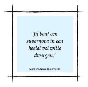 Maar voor nu wil ik wel alvast een paar stukjes delen! Supernovae (te midden van witte dwergen) is minder cosy dan Magnetar en Singulariteit maar valt zeker wel onder het genre ‘romantische SF’. (Niet geheel verrassend, als ik het in wil sturen voor een Valentijnskalender, haha.) In tegenstelling tot het tweeluik (dat in de derde persoon v.t. geschreven is), is Supernovae in de eerste persoon geschreven. Dat vond ik voor zo’n relatief kort verhaal beter werken. In het verhaal (inmiddels een novelle) leer je een aantal personages uit Magnetar kennen in hun jonge(re) jaren en zie je hoe ‘etherenergie’ ontwikkeld is.
