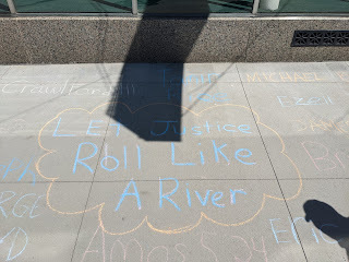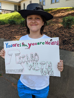 Then my son and I attended two protests. The first was in Louisville with other families. We made signs and we stood on a busy street in a predominately white part of town and shouted the worth of black lives. We stood in solidarity with our black brothers and sisters saying, we see you, we see what is happening, and we will not stand for it anymore. I think my favorite memory from that day was watching the faces of the black people driving by, the smiles of being seen. And watching my son soak it all in and having hard conversations about what we were trying to do. We also attended a protest in New Albany where we wrote the names of those killed by police on the sidewalks and kneeled on the hot sidewalk for 8 1/2 minutes in silence. We were putting our privilege where our mouth was. And this was all shared on social media.