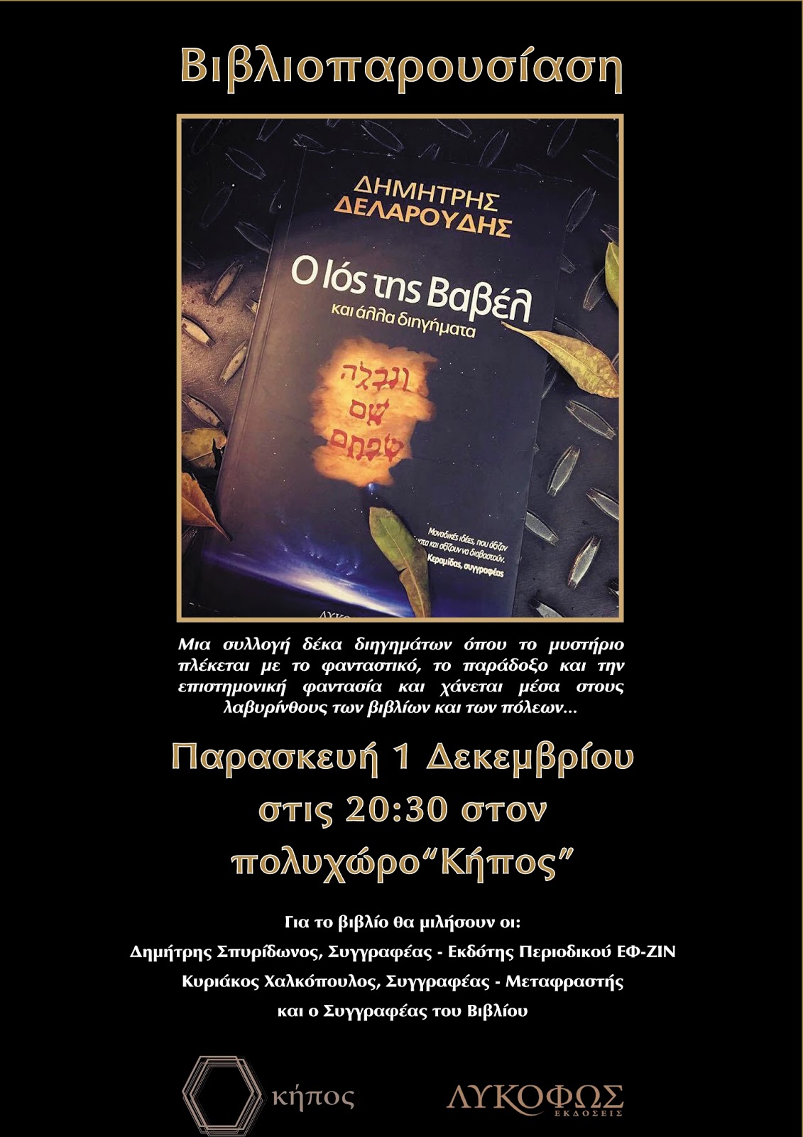 Το έργο ονομάζεται «Ο Ιός της Βαβέλ και άλλα διηγήματα» και συγγραφέας του είναι ο πολυβραβευμένος στον χώρο της φανταστικής λογοτεχνίας, Δημήτρης Δελαρούδης. Η συλλογή κυκλοφορεί απο τις εκδόσεις Λυκόφως.
