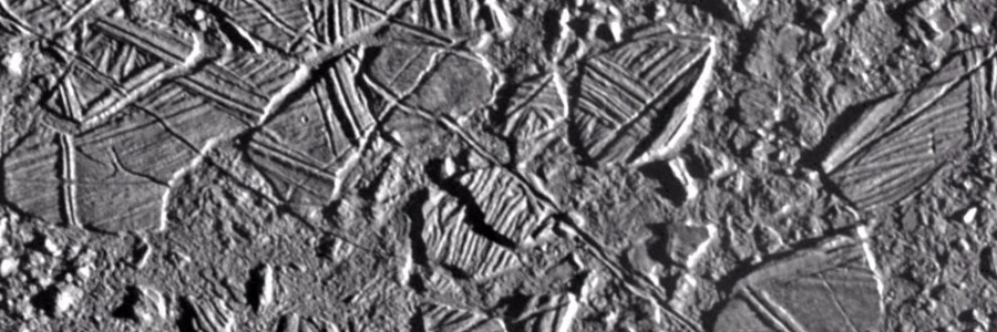 This high resolution image shows the ice-rich crust of Europa, one of the moons of Jupiter. Seen here are crustal plates ranging up to 13 km (8 miles) across, which have been broken apart and “rafted” into new positions, superficially resembling the disruption of pack-ice on polar seas during spring thaws on Earth. The size and geometry of these features suggest that motion was enabled by ice-crusted water or soft ice close to the surface at the time of disruption. The area shown is about 34 km by 42 km (21 miles by 26 miles), centered at 9.4 degrees north latitude, 274 degrees west longitude, and the resolution is 54 m (59 yards). This picture was taken by the Solid State Imaging system on board the Galileo spacecraft on 20 February 1997, from a distance of 5,340 km (3,320 miles) during the spacecraft’s close flyby of Europa.