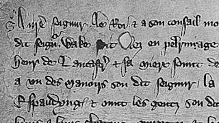 Sometime in 1320, after 6 June and before 24 November, Blanche of Lancaster presented a petition in Anglo-Norman to Edward II and his council, calling herself 'Blaunche Wake, cousin of our lord the king and consort of Lord Wake' and stating that her husband had gone on pilgrimage to Santiago de Compostela (seint Jake) with royal permission. [4] She added rather plaintively that 'her father Sir Henry of Lancaster and her mother are overseas, and therefore she remains alone'. Blanche went on to say that one of her husband's manors had been attacked by 'numerous robbers and murderers' from the town of Spalding in Lincolnshire, who had killed some of Thomas Wake's servants and her own, and badly wounded others to the point of death. She did not specify which manor, but Thomas held several in Lincolnshire, including Bourne and Market Deeping, which are both about twelve miles from Spalding. The people from Spalding had also stolen goods and chattels from the manor, and had taken away the dead bodies (les corps de eux q' sont mortz aloignez), an unusual detail which I don't recall seeing in a fourteenth-century petition before. Blanche finished by stating that she and her 'ladies', i.e. her attendants, were so frightened and distressed that they did not dare to stay at the manor, and she begged Edward II and the royal council to help her as soon as possible. Unfortunately, they did not, but only responded that she had no right to an action resulting from the petition. I haven't been able to find any other reference to this attack on a nearby manor by the people of Spalding.