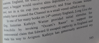 And last but definitely not least, did you know that William Ockham or Occam, of Occam's Razor fame, was a Franciscan friar from Surrey who was almost exactly the same age as Edward II? William is believed to have been born in or around 1287, and died in 1347. Michael Harmon has written a novel called Invincibilis about him, with Edward II, Hugh Despenser the Younger and Eleanor de Clare as important characters. It's available on Amazon UK and Amazon US. Many thanks to Michael for sending me a copy and for kindly mentioning me in the Acknowledgements! If you're interested in Edward II's fate in 1327, it's well worth a read (and is well worth a read even if you're not particularly!).