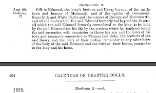 [image error]Edmund died on 5 June 1296. The bulk of his vast estate went to his eldest son Thomas, though in August 1292 Edmund had arranged for his four castles in Wales plus the Gloucestershire manors of Rodley and Minsterworth to pass to his second son Henry. Thomas was named as heir to these estates if Henry died without children, with John as next heir. [Calendar of Charter Rolls 1257-1300, p. 423; The National Archives DL 10/191]