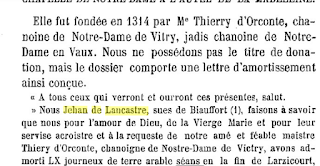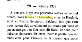 John and Alix de Joinville were married by July 1312 when a grant made to the abbey of Chapelle-aux-Planches by Jehans de Lancastre, sires de Biaufort [lord of Beaufort], et Aalis de Joinville is recorded. Alix is called John's 'loyal consort and wife' (sa loiaulx compaigne et espouse). To put the date into context, that's the month after Piers Gaveston, beloved of John's cousin Edward II, was killed in Warwickshire, and four months before John's niece Isabella, queen of England, Juana's daughter, gave birth to the future Edward III.
