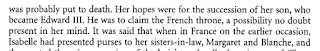 This is a classic example of history written with hindsight, of knowing that Edward III of England claimed the French throne in 1337, and assuming that his mother somehow had foreknowledge of this, or had planned for it to happen and thus manipulated events so that it might come to pass, as early as 1314 when Edward was a toddler. For all three of Isabella's brothers to die comparatively young, and for all four or more of their sons to die in childhood, was a series of relatively improbable events which she could not have anticipated. For all Isabella knew in 1314, her brothers might all live into their fifties or sixties and father six or ten or twelve healthy sons between them, and the Capetians might manage another 300 years of male succession to the throne of France.
