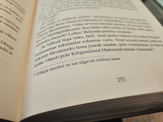 Ühe lõbusa killuna – esimese raamatu puhul häirisid mind pidevad joonealused märkused ja raamatu lõpus olev “entsüklopeedia”. See pigev lappamine lõhkus lugemise rütmi. Järgmistes raamatutes ei olnud joonealuseid märkuseid vist üldse (või kui, siis mõni üksik). Ja viimane raamat oli õnnistatud vaid ühe joonealuse märkusega:
