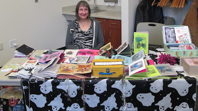 A photo of Juliet Cook at the Blood Pudding Press table at Get Sharp! Ohio Poetry Publishing Conference sponsored by the Ohio Poetry Association, at the Cuyahoga County Public Library's South Euclid-Lyndhurst branch, on Saturday November 15, 2025.