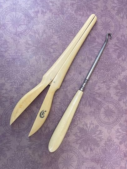 El buttonhook era una herramienta muy útil que se usaba para abrochar los diminutos botones de guantes y zapatos. Consistía en un pequeño gancho unido a un mango, y se utilizaba insertando el gancho en el ojal para capturar el botón por el vástago y poder así pasarlo a través de la abertura.