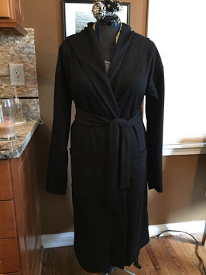 Remember my peacock robe? This is same pattern, done up in black sweatshirt fabric, before the sleeves were hemmed.
