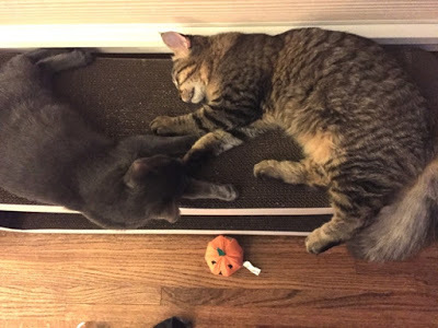 Victor's about a month older than Wolfie but is a lot bigger. We think he's part (or all) Maine Coon. Wolfie looks like he may be a Russian Blue.