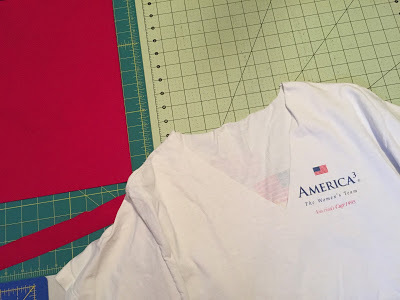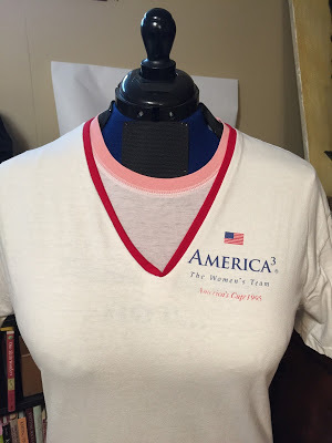 I took an old tee and cut away the neck into a v-neck shape. I then cut a binding strip 1 and 3/8-inches wide and the full length of the fabric.