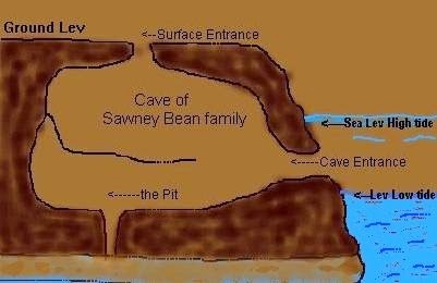 The leader was identified Sawney Bean who had been born Alexander Bean in East Lothian. He had left Leith 25 years before with his wife. They had 8 sons and 6 daughters, 18 grandsons and 14 granddaughters all inbred. And they were cannibals. The story appears well documented in The Newgate Calendar, a crime catalogue of the notorious Newgate Prison in London. It says that Bean was the son of a ditch digger and hedge trimmer but Bean Jnr soon realised he had no taste for honest toil.