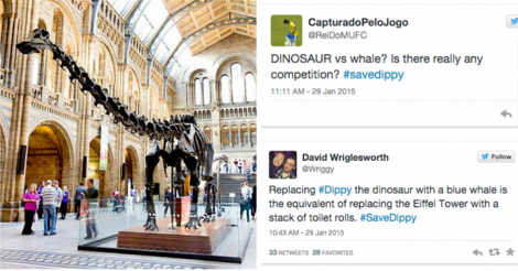 The lower comment says that replacing Dippy with a blue whale is like replacing the Eiffel Tower with a stack of toilet rolls.