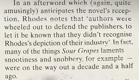 Amazing – but not in a good way. In Sour Grapes I make lots of gags about the London book scene being ruled by toffs, but DJ Taylor derides me for this, seeming to be under the impression that one day, somewhere around 2007, somebody high up blew a whistle and the British publishing world magically turned into an egalitarian paradise. This is the kind of laughably demented hogwash you’d expect from The Spectator, but it’s a bit tragic to see the same insidious sentiment in Private Eye. In both reviews it’s central to Taylor’s dismissal of the book, brought in as a concluding flourish, but I wonder why the Eye waved through such transparent piffle. I can’t help wondering whether it would have anything to do with DJ Taylor being an old Oxford University mucker of the Eye’s editor, Ian Hislop? Could it be that Hislop has granted his old frat buddy carte blanche?