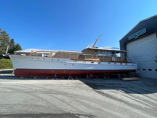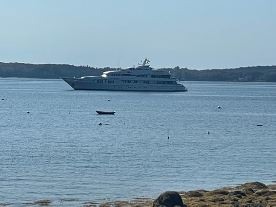 AL caught the L-R at Brooklin Boatyard, where the Trumpy yacht (that's a famous boat builder--not an adjective) Mazurka had just been hauled out. Built 1955, formerly known as Annabelle). Meanwhile, out in the Reach, a mega-yacht (see below) had dropped an anchor.