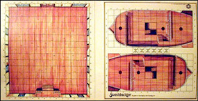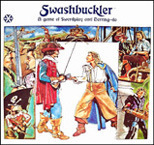 The cover and interior mapboard for Swashbuckler (1980), which simulated shipboard battles and tavern brawls, complete with throwing flagons of ale, swinging from chandeliers, and yanking the rug out from under the opposition.