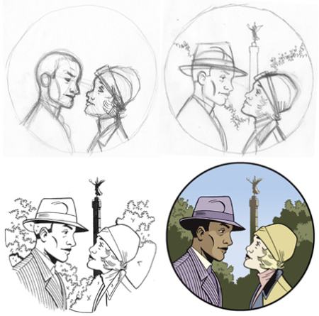 The above images show the four stages I recently went through to complete the cover illustration for the German edition of Berlin: City of Smoke. You can see in that first sketch that my drawing often starts out looking pretty awkward, and gets improved through a process of refinement. Figure placement gets readjusted, facial features are shifted, tiny details added or removed. The hardest part about this drawing was making the composition work with the Siegess��ule (Victory Column) in the background, and I think it’s marginally successful. The only part I’m not really happy with is Kid Hogan’s head, which in retrospect looks a little squished.