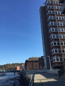 In The Office Spy Rex and Eddie are hired to find a corporate spy in an office. I was inspired by this building along the river. There is no public walkway in the book as I wanted there to be moments where Eddie was dangerously close to falling into the river.